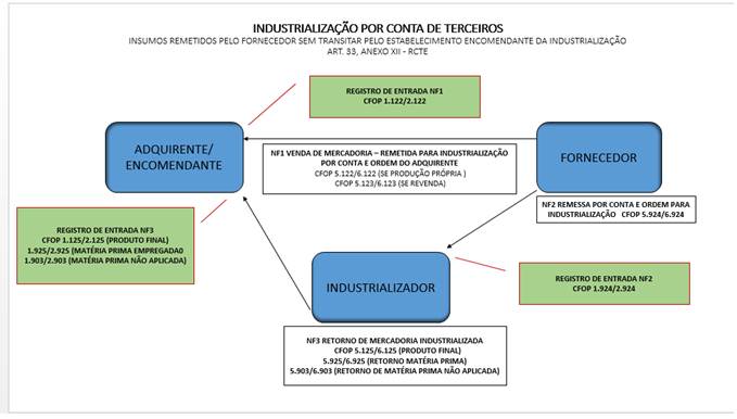 •NF1 nota fiscal em nome do estabelecimento adquirente, da qual devem constar também, nome, endereço, inscrição estadual e CNPJ do estabelecimento em que os produtos serão entregues (industrializador), bem como a circunstância de que estes se destinam à industrialização” (art. 33, I, “a” do Anexo XII do RCTE), com CFOP 5.122/6.122 ( Venda de produção do estabelecimento remetida para industrialização, por conta e ordem do adquirente, sem transitar pelo estabelecimento do adquirente) ou 5.123/6.123 (Venda de mercadoria adquirida ou recebida de terceiros remetida para industrialização, por conta e ordem do adquirente, sem transitar pelo estabelecimento do adquirente), com destaque do imposto, quando devido, que deve ser aproveitado como crédito pelo adquirente, se for o caso” (Art. 33, I, “b” do Anexo XII do RCTE);
